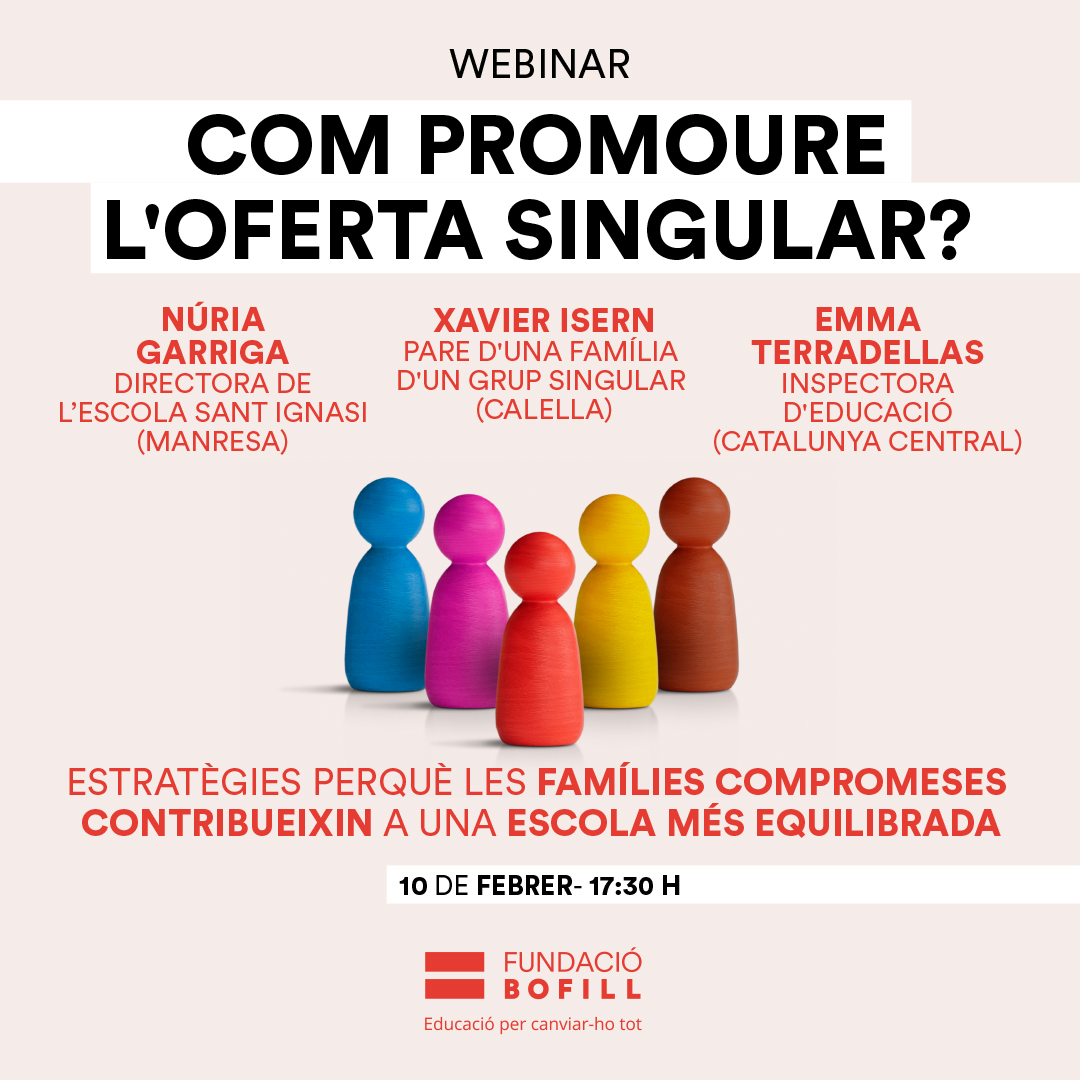 Aquest webinar que podreu seguir onlineel 10 de febrer a les 17.30 h estarà conduït per la referent de polítiques contra la segregació escolar de la Fundació Bofill, María Segurola, i comptarà amb Núria Garriga, directora de l’escola Sant Ignasi (Manresa), Emma Terradellas, inspectora d'Educació de Vic (Catalunya Central) i Xavier Isern, pare d'una família que va participar d'un grup singular.