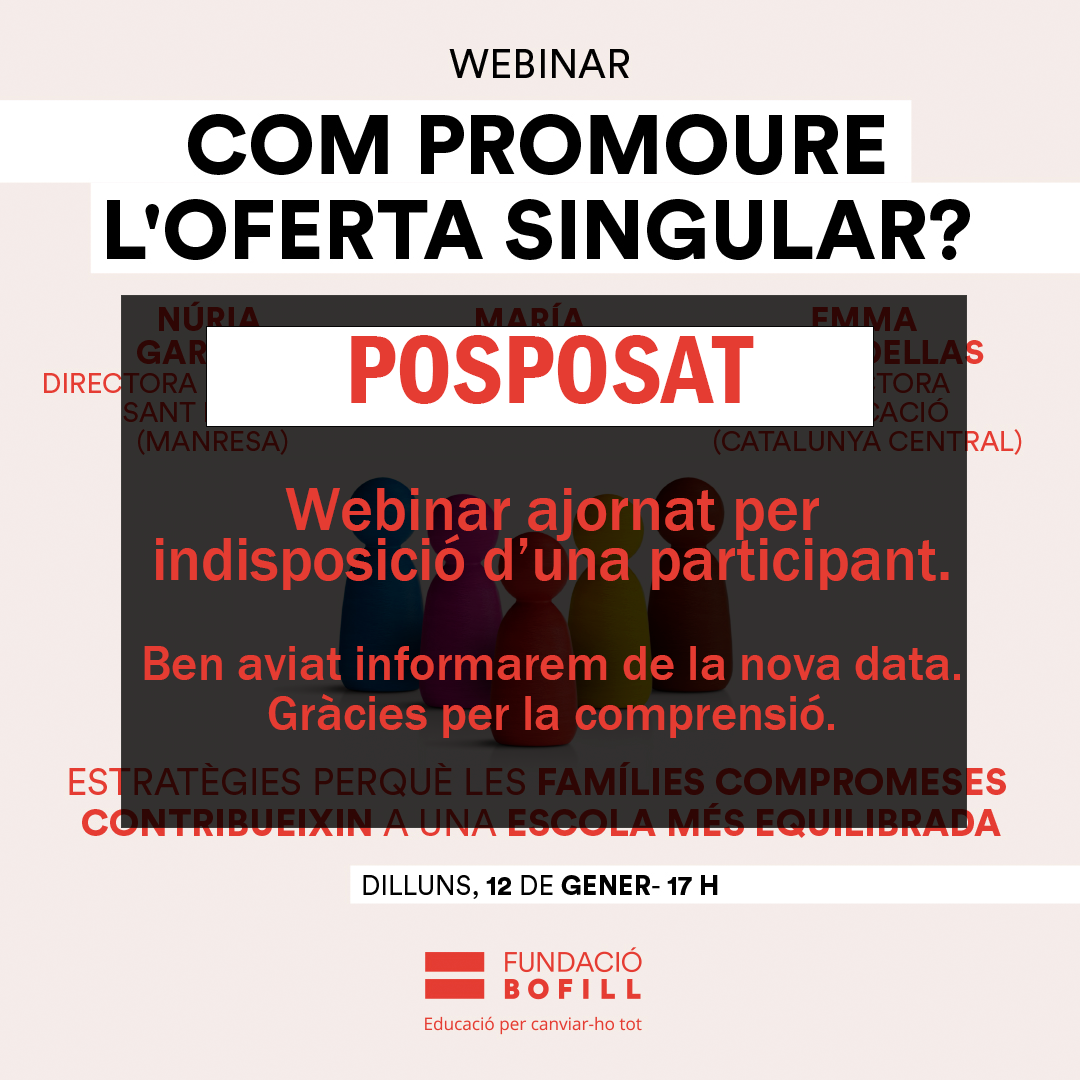Aquest webinar online estarà conduït per la referent de polítiques contra la segregació escolar de la Fundació Bofill, María Segurola, i comptarà amb Núria Garriga, directora de l’escola Sant Ignasi (Manresa), Emma Terradellas, inspectora d'Educació de Vic (Catalunya Central), i una representació de famílies que han apostat per ser un grup singular. Estava previst pel dilluns 12 de gener (17h) però, per indisposició d'una de les participants, ha quedat posposat. Ben aviat informarem de la nova data d'emissió.