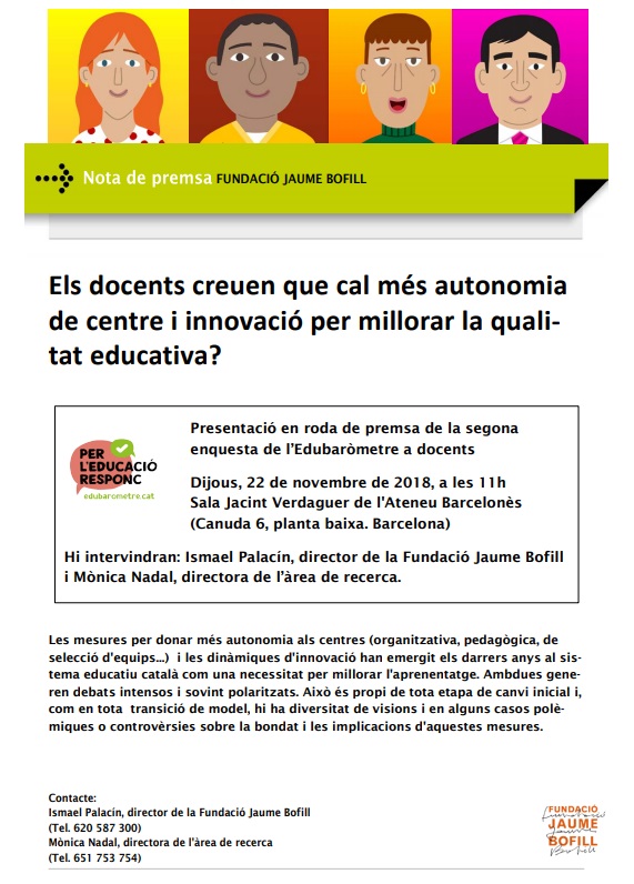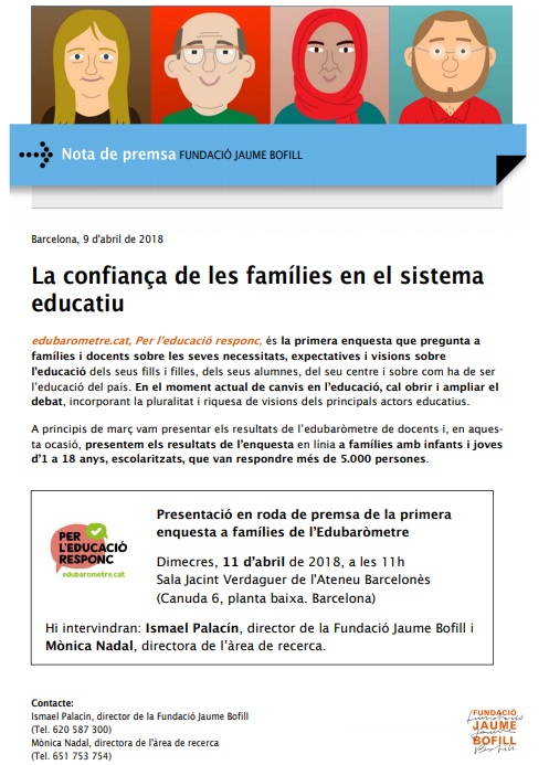 Presentació en roda de premsa de la primera enquesta de l’Edubaròmetre. Dijous, 1 de març de 2018, a les 11 h: Sala Jacint Verdaguer de l’Ateneu Barcelonès, (Canuda 6, planta baixa. Barcelona) Hi intervindran: Ismael Palacín, director de la Fundació Jaume Bofill i  Mònica Nadal, directora de l’àrea de recerca.  edubarometre.cat, Per […]