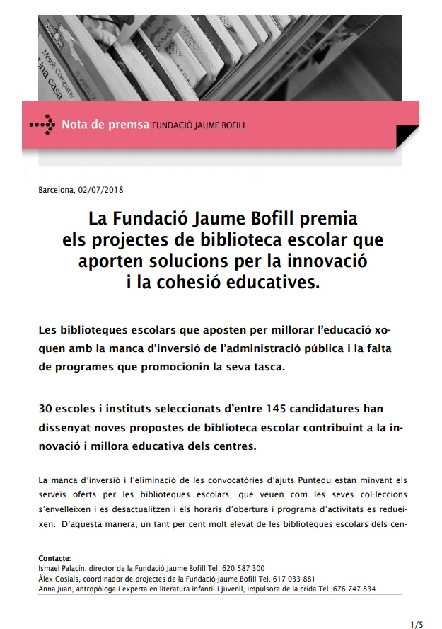 La Fundació Jaume Bofill premia els projectes de biblioteca escolar que aporten solucions per la innovació i la cohesió educatives