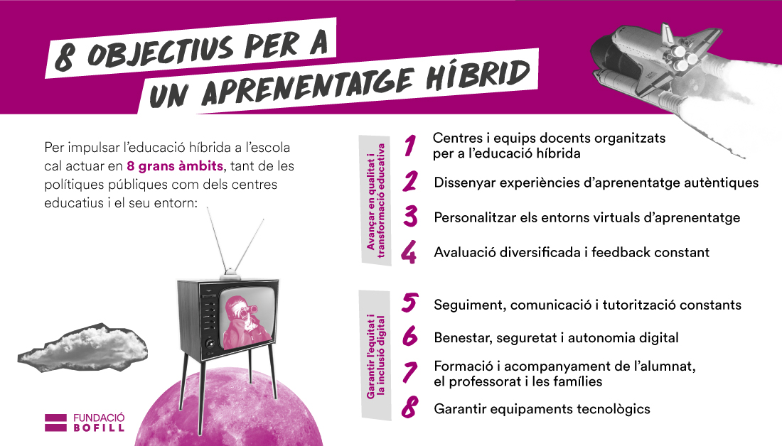 Segons el Departament d’Ensenyament, “amb l’educació híbrida s’afavoreix la transformació educativa dels centres a través de l’impuls de la seva autonomia i la implicació de la comunitat escolar i de tots els agents educatius de la zona. S’impulsa l’educació digital de l’alumnat, el professorat, les famílies i l’entorn.”