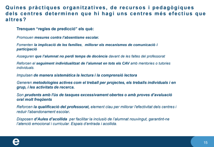 Un altre punt clau que visibilitza l'estudi és que un 68,4% d'aquests 60 instituts més vulnerables que millor combaten l'AEP disposen d'un Pla de Comunicació, enfront del 40% dels centres vulnerables menys efectius, "perquè les famílies tenen un major sentiment de pertinença".