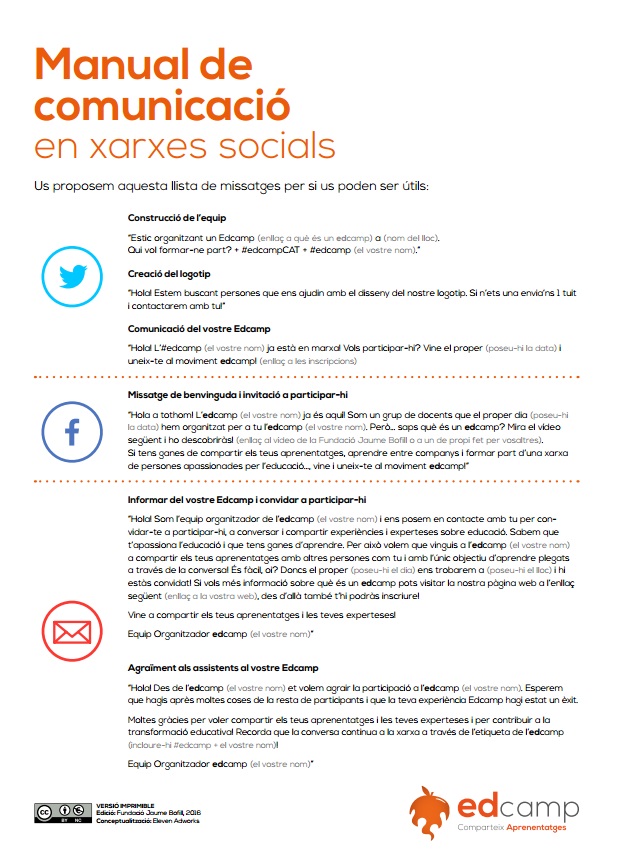 The Fundació Jaume Bofill aims to promote this model in Catalonia and, in partnership with the Edcamp Foundation of the United States, wants to extend this methodology to individuals, groups and educational communities who want to organise their own Edcamps. The support offered by the Fundació to the team of promoters of each Edcamp will be free and will cover training, guidance and logistical and communicative support.