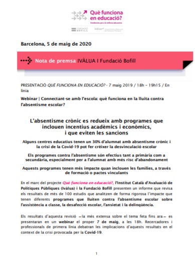 En el marc del projecte Què funciona en educació?, l’Institut Català d’Avaluació de Polítiques Públiques (Ivàlua) i la Fundació Bofill presenten un informe que revisa els resultats de més de 100 estudis que analitzen de forma rigorosa l’impacte que tenen diferents programes que lluiten contra l’absentisme escolar sobre l’assistència a classe, la desafecció escolar, l’ansietat i la delinqüència.