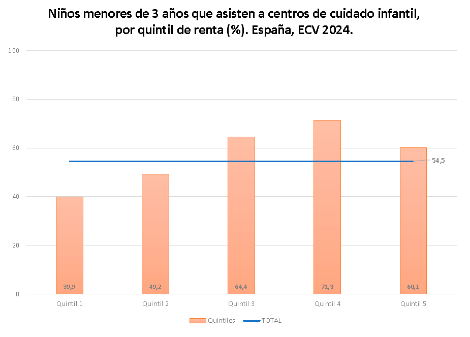Amb un 71% d’escolarització infantil el curs 2022-23, l’estat espanyol està en una bona posició a nivell europeu. Però hi ha moltes diferències: les famílies de més renda escolaritzen els fills i filles un 60%, mentre que en les de menys renda no arriba al 40%.